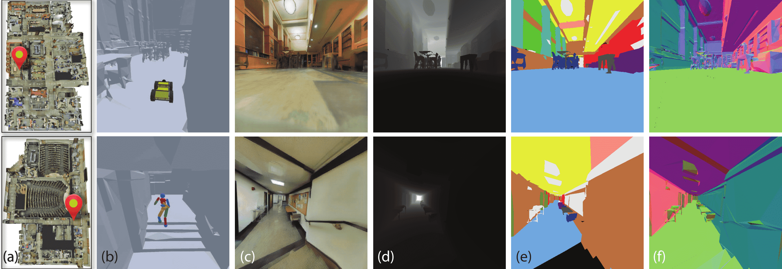 Use our opensource platform to explore active and real-world perception. Above: two agents in Gibson. The agents are active, embodied, and subject to constraints of physics and space (a,b). They receive a constant stream of visual observations as if they had an on-board camera (c). They can also receive additional modalities, e.g. depth, semantic labels, or normals (d,e,f). The visual observations are from real scanned buildings.